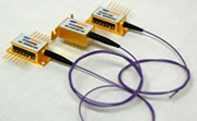 Fiber-Optic Link Testing : Superluminescent Diode (SLD) is used in the diagnostics of optical fiber communication networks in the 1310nm and 1550nm bands. The chromatic dispersion of an optical medium is the phenomenon that the phase velocity and group velocity of light propagating in a transparent medium depending on the optical frequency. Dispersion has an important impact on the propagation of optical pulses, because a pulse always has a finite spectral width (bandwidth), so that dispersion can cause its frequency components to propagate with different velocities. Normal dispersion, for example, leads to a lower group velocity of higher-frequency components, and thus to a positive chirp, whereas anomalous dispersion creates negative chirps. The frequency dependence of the group velocity also has an effect on the pulse duration. If the pulse is initially unchirped, dispersion in a medium will always increase its duration (dispersive pulse broadening). In optical fibers, there is usually some slight difference in the propagation characteristics of light waves with different polarization states. This is called polarization mode dispersion (PMD) [3]. A differential group delay can occur even for fibers that according to the design should have rotational symmetry and thus exhibit no birefringence. This effect can result from random imperfections or bending of the fibers, or from other kinds of mechanical stress, and is also affected by temperature changes. Mainly due to the influence of bending, the PMD of a cabled fiber can be completely different from that of the same fiber on a spool. Modern fiber cables as used in fiber-optic links have been optimized for low PMD, but the handling of such cables can still have some influence. PMD can have adverse effects on optical data transmission in fiber-optic links over long distances at very high data rates, because portions of the transmitted signals in different polarization modes will arrive at slightly different times. Effectively, this can cause some level of pulse broadening, leading to inter-symbol interference, and thus a degradation of the received signal, leading to an increased bit error rate. The chromatic dispersion and polarization mode dispersion (PMD) can be measured by using the large bandwidth, high power spectral density, and low ripple characteristics of Superluminescent Diodes (SLD). WDM PON Systems: The Wavelength Division Multiplexing (WDM) Passive Optical Networks (PON) have been used and developed as one of the approaches for Fiber To The Home (FTTH) network systems. As a low-cost laser source at the Optical Network Unit (ONU) in such WDM PON systems, the Fabry Perot (FP) laser diode (LD) wavelength is locked to a selected wavelength channel of the broad-band Amplified Spontaneous Emission (ASE) source. Fig. 4 shows an architecture for upstream transmission employing wavelength-locked FP LDs. A broad-band ASE source (such as SLD) with an optical circulator is located at the central office. The broad-band ASE is transmitted to the remote node where an Arrayed Waveguide Grating (AWG) slices the ASE spectrally. The spectrally sliced ASE is injected into the FP LD located at the ONU.Fig. 4 WDM PON System Upstream Configuration