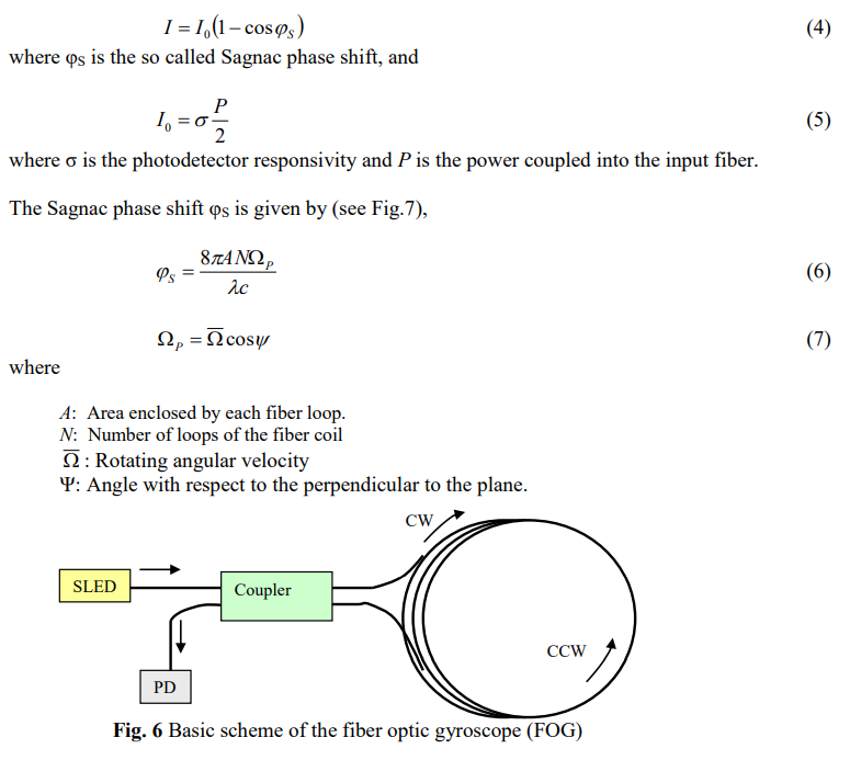 The interferometric fiber optic gyroscope (IFOG) uses an optical interferometer for the very high-resolution readout of the Sagnac phase shift induced between two counter-propagating waves in an optical closed path when the plane of propagation undergoes angular rotation. The basic scheme is illustrated in Fig. 6. It is a passive interferometer where the fiber optic coupler is employed to split the radiation from the light source into two counter-propagating waves, clockwise (CW) and counterclockwise (CCW), in the fiber coil and to recombine the waves, after propagation, on a photodetector PD. The phase difference is thus cumulated over a long fiber coil for obtaining high responsivity with a compact device. For ideal fibers and components, the output photo-generated current I has the following expression: