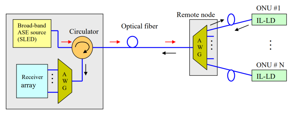 An architecture for upstream transmission often employs wavelength-locked FP LDs. Here, a broadband ASE source, such as a Superluminescent Diode Device (SLD) with an optical circulator, is located at the central office. This broadband ASE is transmitted to a remote node where an Arrayed Waveguide Grating (AWG) spectrally slices the ASE. The spectrally sliced ASE is then injected into the FP LD located at the ONU, enabling efficient and cost-effective data transmission.