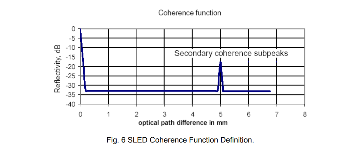 Coherence Function defines the secondary coherence sub-peak (reflectivity, dB) versus the optical path difference (or optical displacement) in mm as shown in Fig. 6. Spectrum modulation results in parasitic subpeak in coherence function at the optical path difference at a distance equal to 2neffL where neff is the effective refractive index for optical mode and L is the active length of the SLED. The intensity of secondary coherence sub-peak is determined by the integral value of the spectrum modulation across the entire spectrum. Secondary coherence sub-peak should be as low as possible.